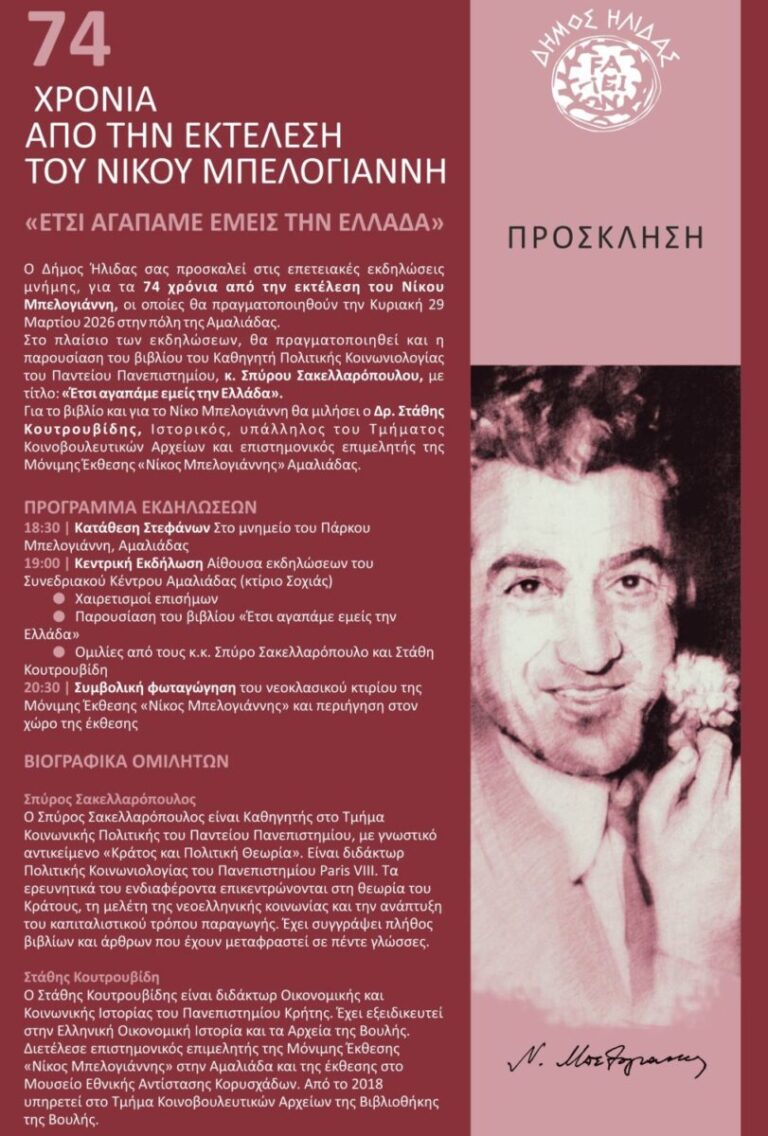 Μια ξεχωριστή εκδήλωση για την ιστορική διαδρομή του «ανθρώπου με το γαρύφαλλο», του Νίκου Μπελογιάννη, διοργανώνει την Κυριακή 29 Μαρτίου 2026 ο Δήμος Ήλιδας, με αφορμή τη συμπλήρωση 74 ετών από την εκτέλεση του. Η εκδήλωση, μεταξύ άλλων, αποτελεί έναν…