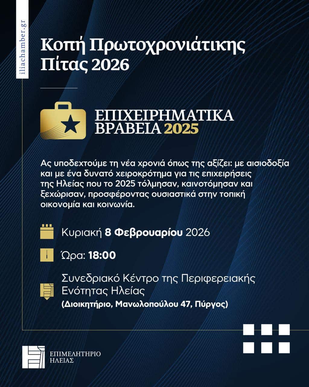 Σας περιμένουμε στην ετήσια εκδήλωση αφιερωμένη στις επιχειρήσεις και στους επιχειρηματίες της Ηλείας, τιμώντας όσους ξεχώρισαν το προηγούμενο έτος για την πορεία και τη συμβολή τους στην τοπική οικονομία.