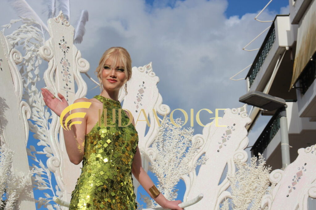 Στη συνέχεια ακολούθησε το άρμα της εντυπωσιακής Βασίλισσας Άρτεμις Σακέτα. Η εμφάνισή της θύμιζε σταρ του παλιού ελληνικού κινηματογράφου, με λάμψη και κλάση. Χαιρετούσε τον κόσμο με χάρη και χαμόγελο, ενώ τα κινητά δεν σταματούσαν να απαθανατίζουν τη στιγμή.