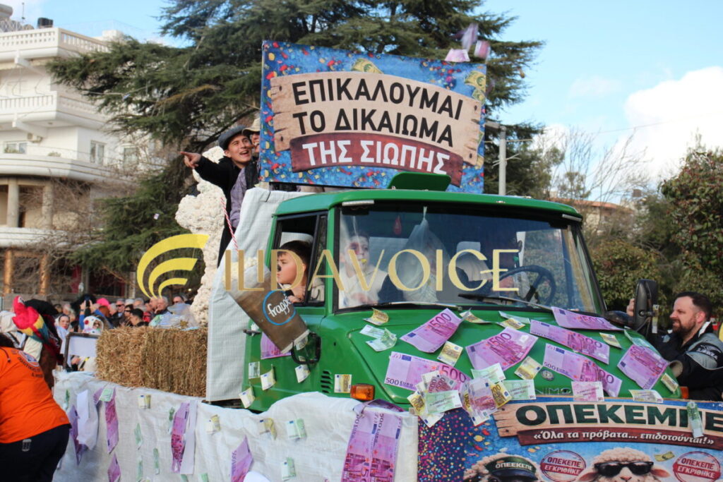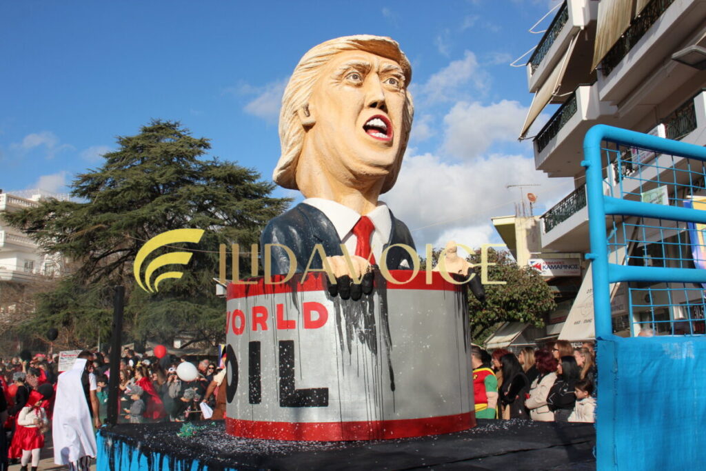 Ιδιαίτερο ήταν και το κοινωνικό μήνυμα του καρναβαλιού, με τον πλανητάρχη Donald Trump να «κολυμπάει» στο πετρέλαιο, σατιρίζοντας τις διεθνείς εξελίξεις και την έννοια της ειρήνης.