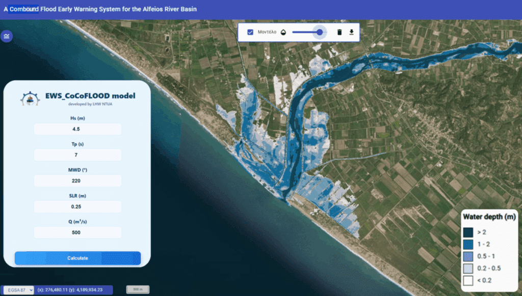 Στο πλαίσιο του EWS_CoCoFlood, που χρηματοδοτείται από το Πράσινο Ταμείο, αναπτύχθηκε ένα καινοτόμο σύστημα έγκαιρης πρόγνωσης συνδυαστικών παράκτιων πλημμυρικών γεγονότων με χρήση Τεχνητής Νοημοσύνης το οποίο εφαρμόστηκε πιλοτικά στην παράκτια ζώνη του Δήμου Πύργου, εκατέρωθεν της εκβολής του ποταμού Αλφειού.